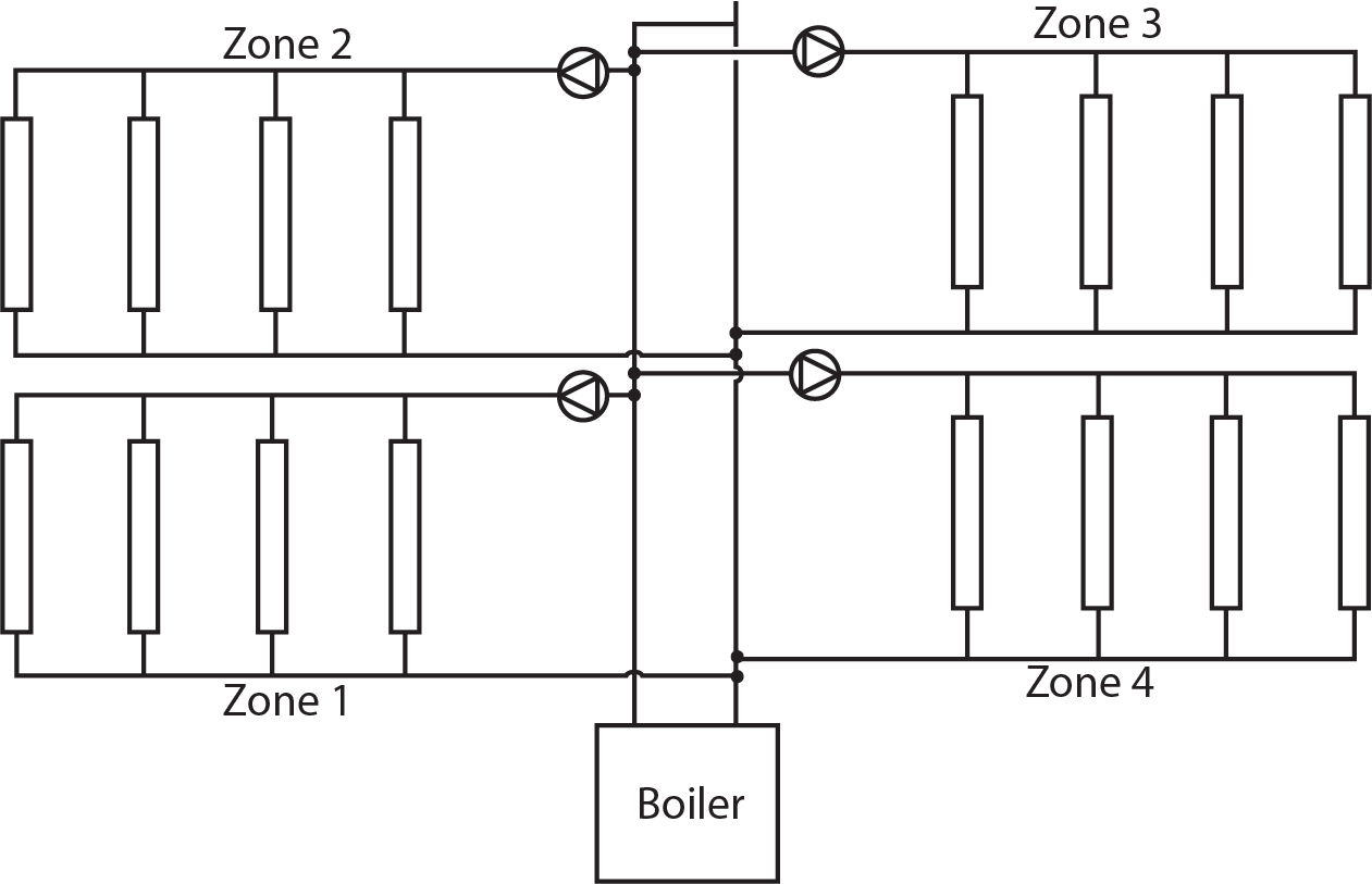 In a commercial system, each zone is typically a two-pipe system supplying many circuits that start and end near the boiler. There is normally one zone for every wing of a large building. The rooms within the wing are served by circuits that connect to the zone piping. Zone valves are installed on each circuit. Figure 11 shows a commercial system that has four zones, with four circuits in each.